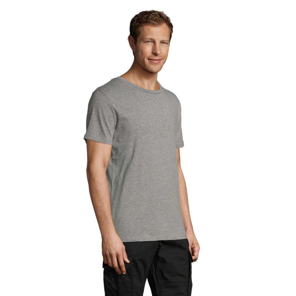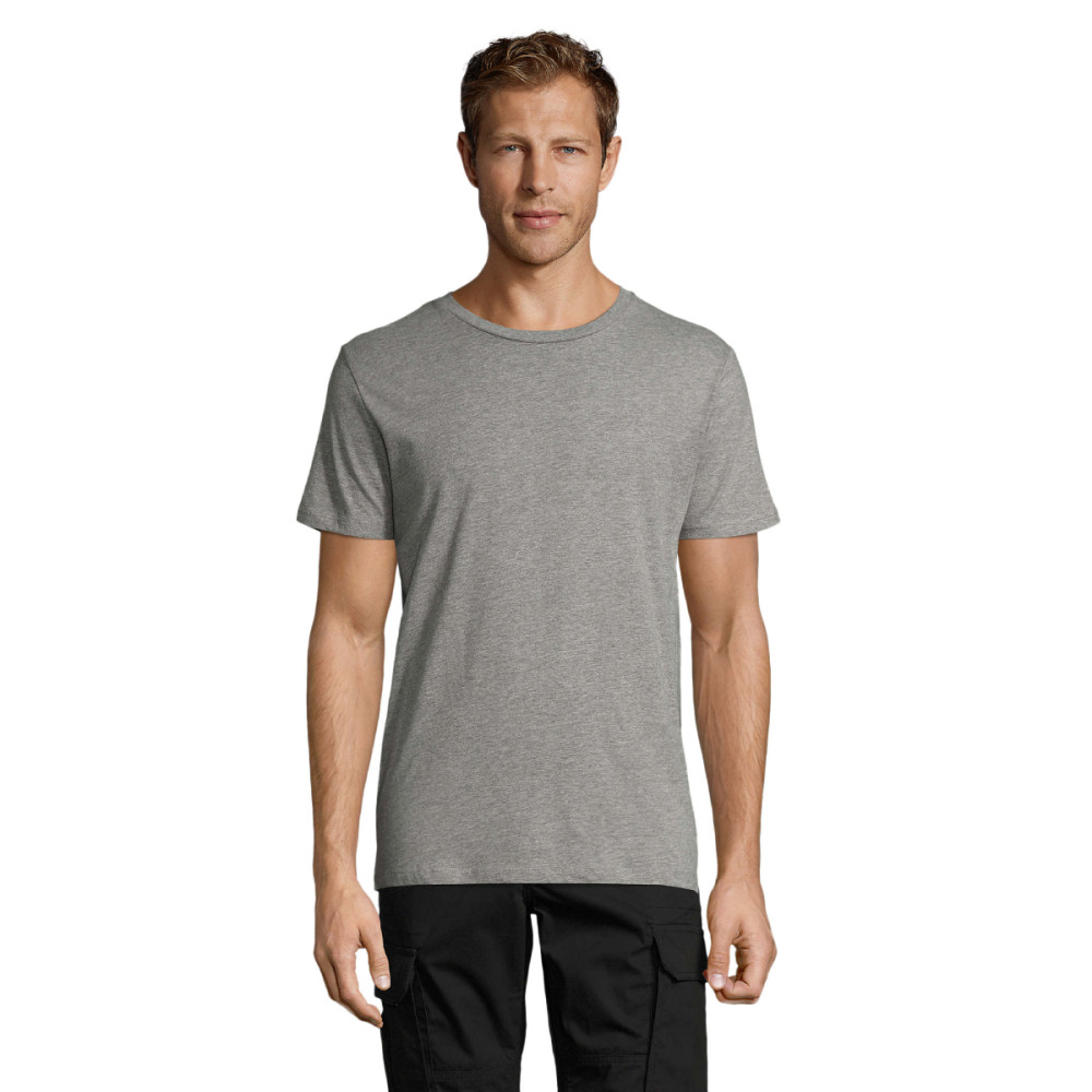 Чоловіча облягаюча футболка з круглою горловиною. Оброблено спеціальними ензимами для додання особливої м'якості виробу - комір в тонку резинку.