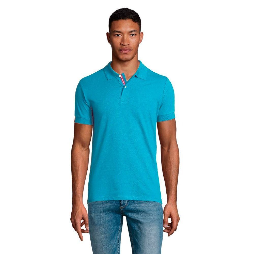 Футболка поло чоловіча SOL'S PATRIOT з коротким рукавом. Контрастна внутрішня сторона коміра. Посилена планка з двома білими перламутровими ґудзиками, контрастна смужка на планці і на внутрішній тасьмі по коміру. Декоративна двоколірна вставка на зовнішній стороні рукава і на бічних розрізах по низу вироба (зсередини). Виріб викроєн з трикотажного полотна. Приталений крій. Запасний ґудзик на внутрішньому боковому рядку вироба.