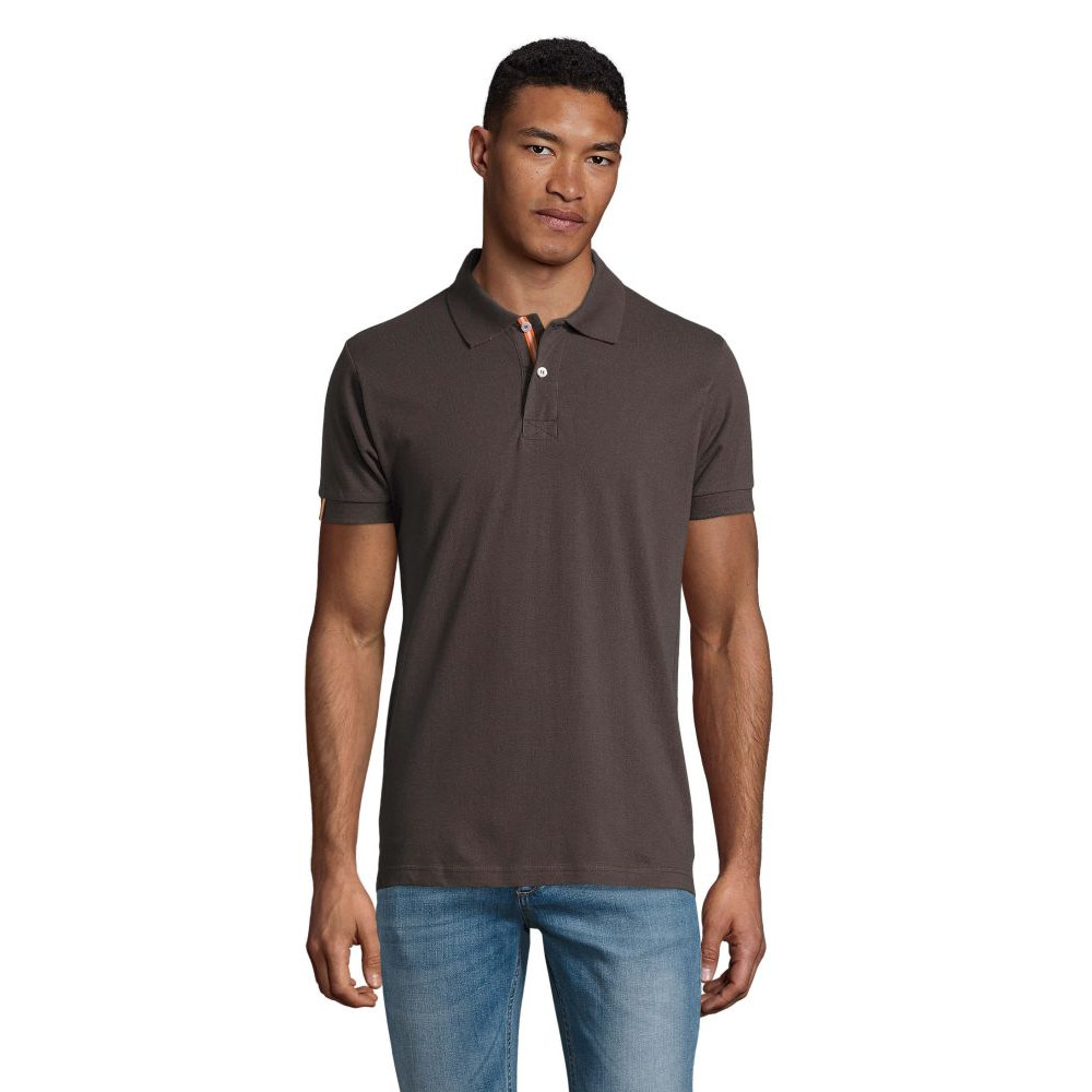 Футболка поло чоловіча SOL'S PATRIOT з коротким рукавом. Контрастна внутрішня сторона коміра. Посилена планка з двома білими перламутровими ґудзиками, контрастна смужка на планці і на внутрішній тасьмі по коміру. Декоративна двоколірна вставка на зовнішній стороні рукава і на бічних розрізах по низу вироба (зсередини). Виріб викроєн з трикотажного полотна. Приталений крій. Запасний ґудзик на внутрішньому боковому рядку вироба.