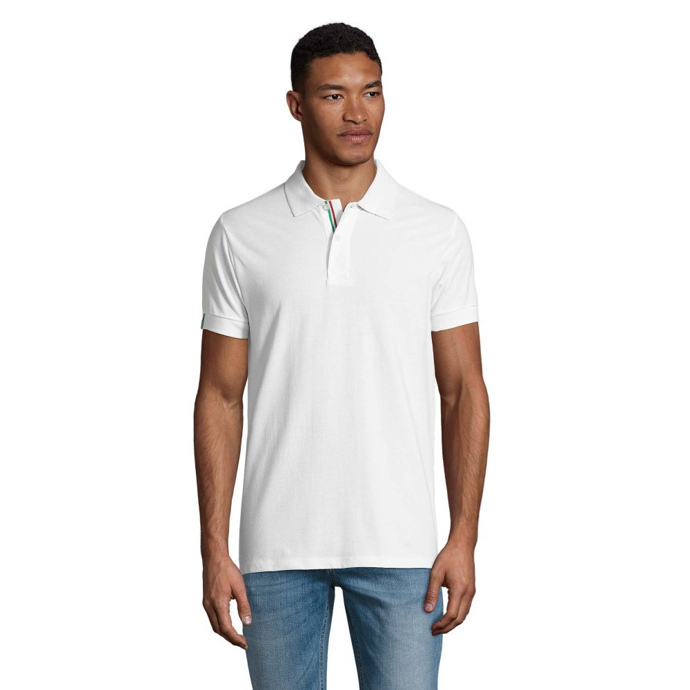 Футболка поло чоловіча SOL'S PATRIOT з коротким рукавом. Контрастна внутрішня сторона коміра. Посилена планка з двома білими перламутровими ґудзиками, контрастна смужка на планці і на внутрішній тасьмі по коміру. Декоративна двоколірна вставка на зовнішній стороні рукава і на бічних розрізах по низу вироба (зсередини). Виріб викроєн з трикотажного полотна. Приталений крій. Запасний ґудзик на внутрішньому боковому рядку вироба.