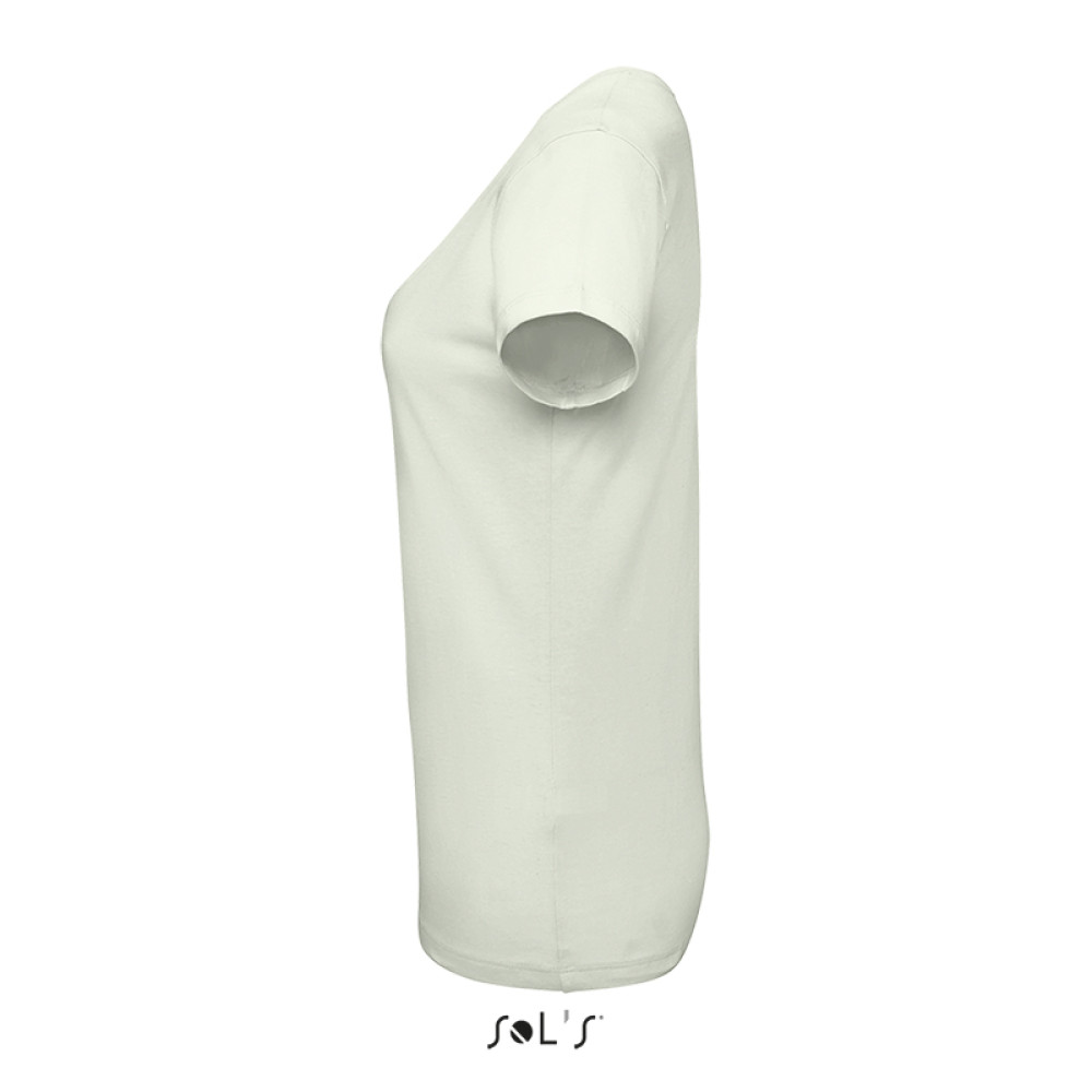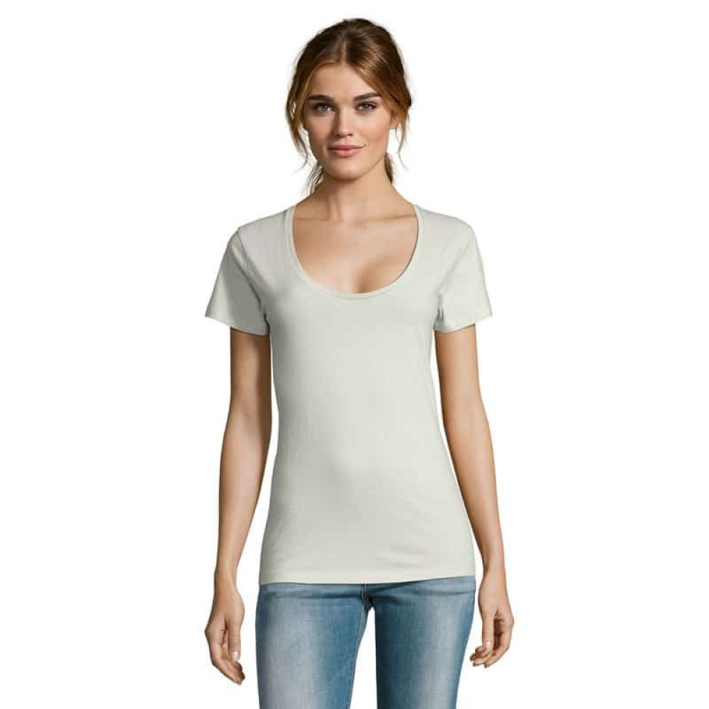 Жіноча футболка з глибоким круглим вирізом METROPOLITAN. Глибокий виріз оброблений резинкою. Короткий рукав. Зміцнююча тасьма по коміру. Кроєний трикотаж, приталений силует. 100% полугребенна бавовна Ringspun Джерсі 150 г / м².