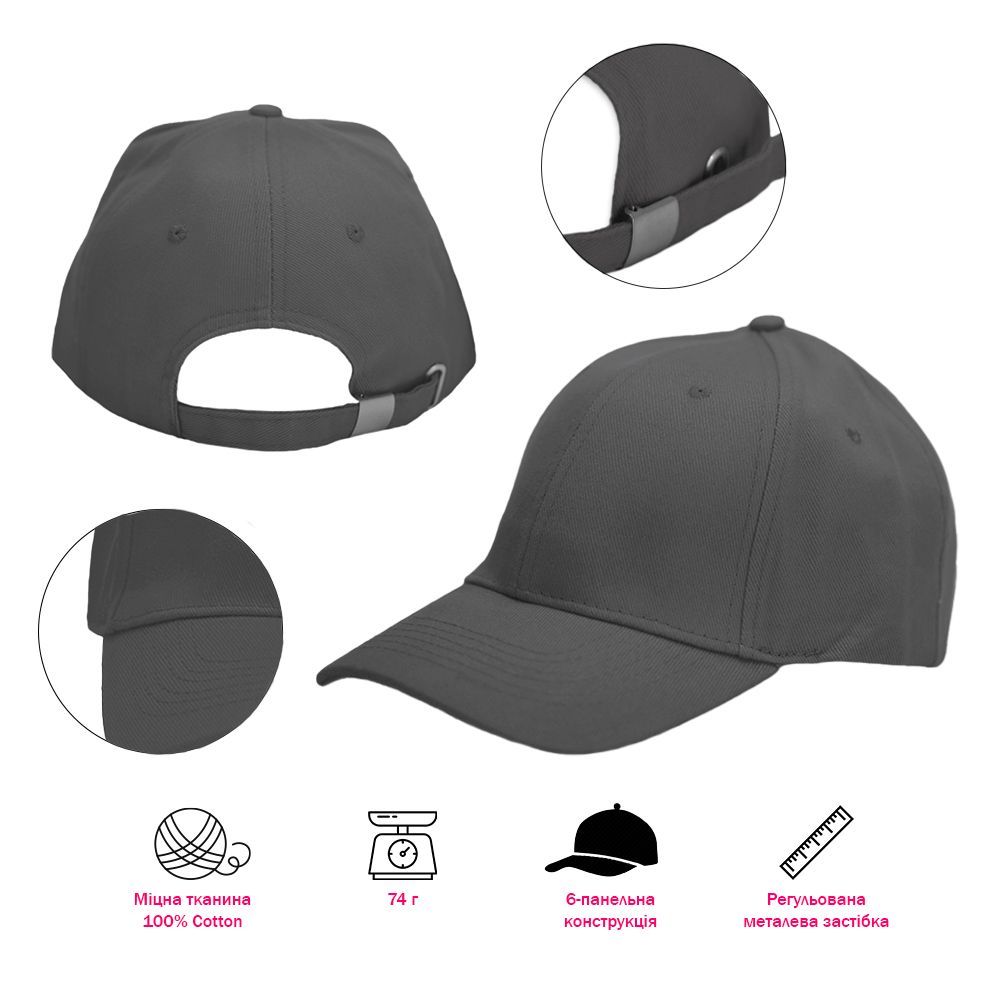 Розмір регулюється за допомогою сріблястої металевої застібки, яка надійно фіксує кепку та підходить для персоналізації методом лазерного гравіювання.