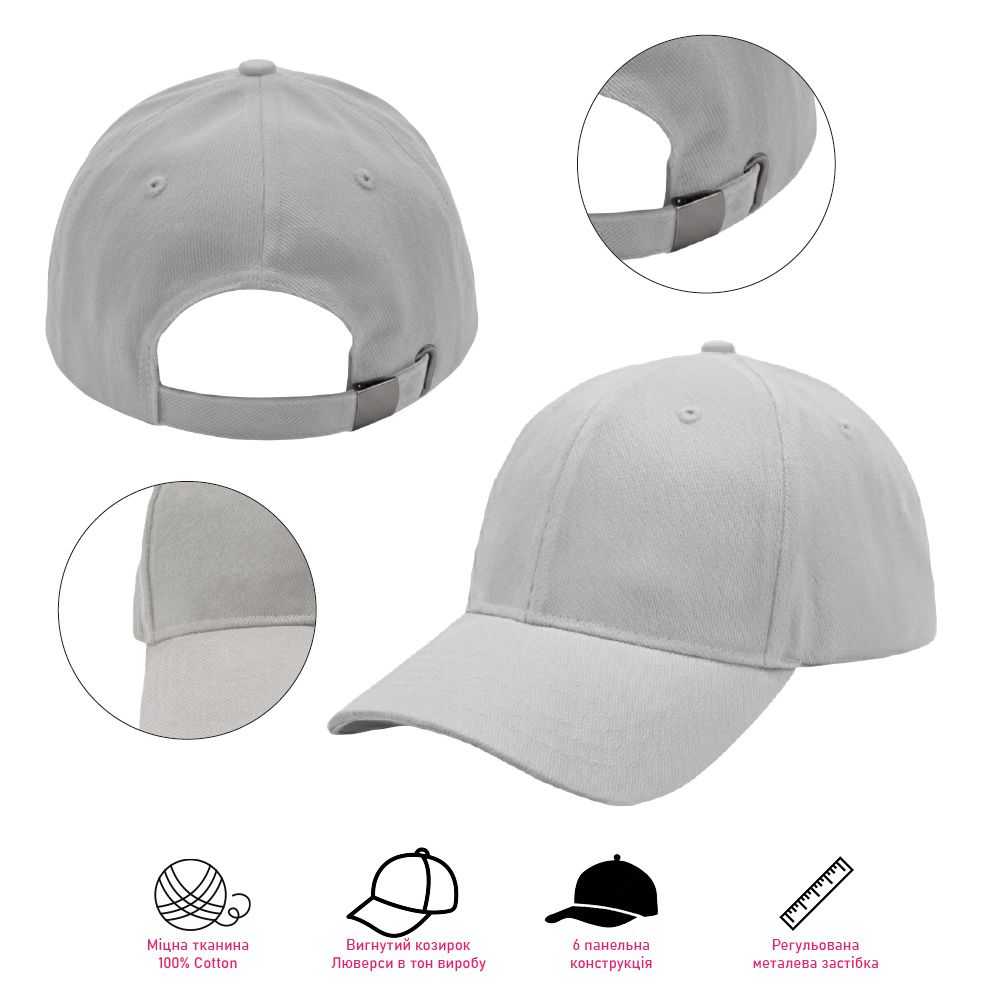Розмір регулюється за допомогою металевої застібки з нікельованим покриттям, яка надійно фіксує головний убір і підходить для персоналізації методом лазерного гравіювання.