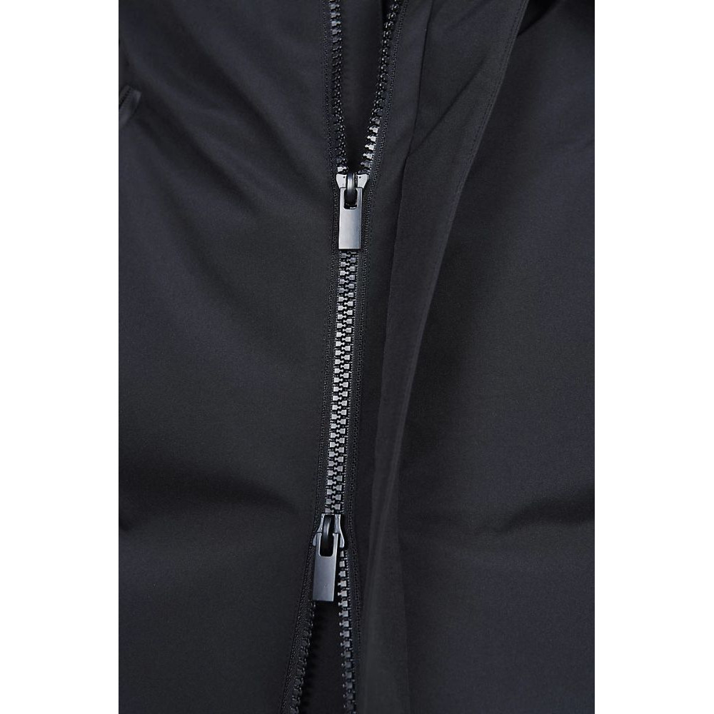Основна застібка на пластиковій блискавці з подвійним металевим бігунком та на потайній планці з магнітом на горловині і в нижній частині для максимального захисту від холоду.