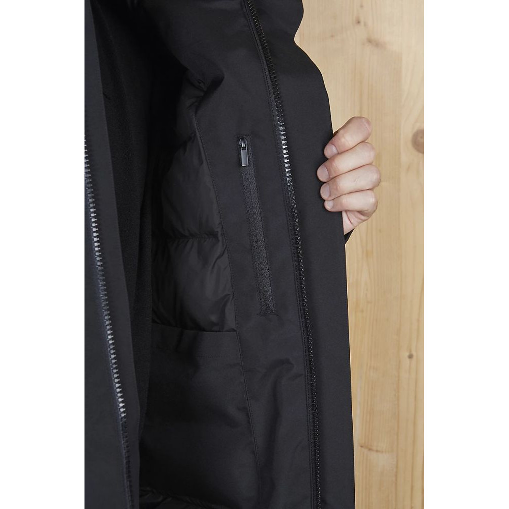 Бічні кишені на блискавці з водовідштовхувального матеріалу. Еластична підкладка на манжетах для комфорту та захисту, виворіт на ніжній стьобаній підкладці. Щільний та комфортний утеплювач. Внутрішня накладна кишеня на магнітній застібці. Є внутрішня вертикальна кишеня на потайній блискавці на рівні серця.
